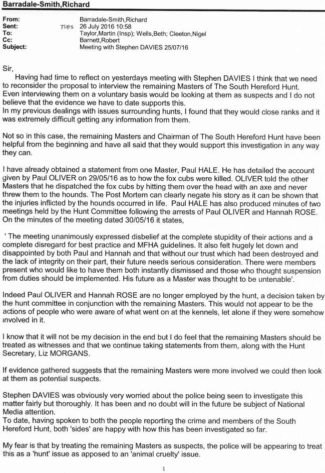 During the meeting with Stephen Davies at Hereford Police Station it had been suggested that the remaining masters of the SHH should be interviewed about this offence. Having been the only investigating officer until this point, and having slept on the suggestion of this, on 26th July 2016 I sent the following email to the CID officers. I wanted to be seen to be completely fair and impartial on both sides.