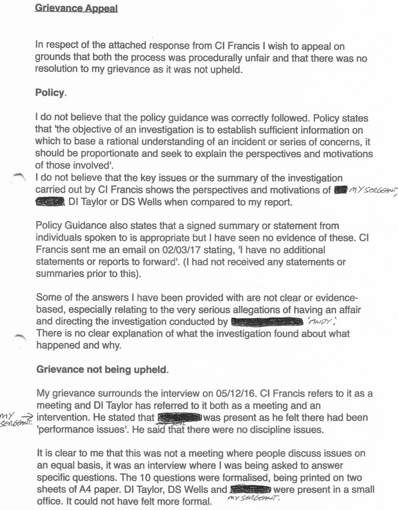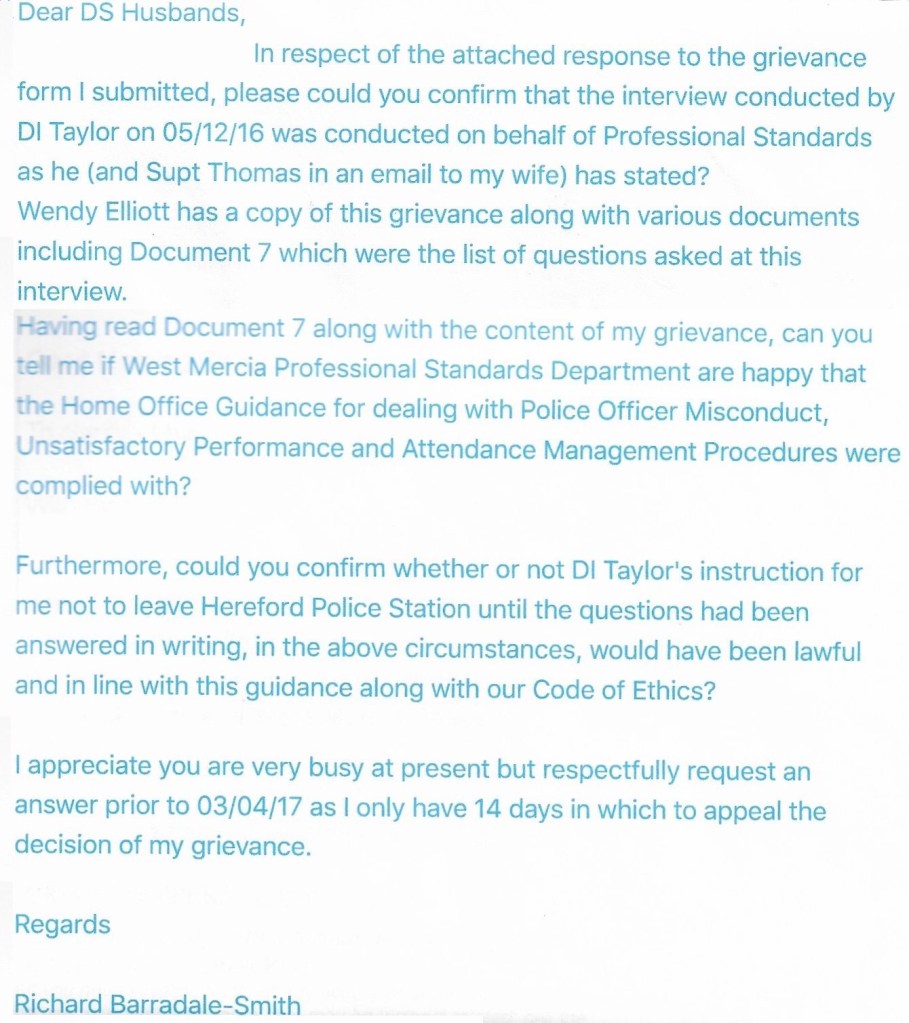 So, where were we? I’d had a half hearted apology from my Chief Inspector who said there was no evidence of my having any affairs. I’d also been informed that the Misconduct case against me was being dropped but my grievance had not been upheld. On 27th March 2017 I sent this email to DS Nicholas Husbands in PSD..