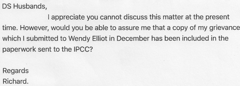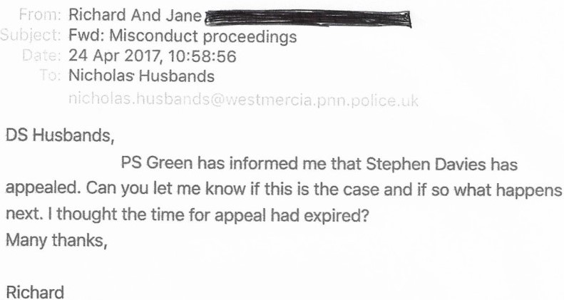 What I was then surprised about, was a phone call I had from my sergeant. He told me that Public Prosecutor, Stephen Davies, (who was of course no longer anything to do with this case)!!, had appealed the Professional decision of DCI Goosen, (PSD), that there was no case to answer in respect of my Misconduct. This surely couldn’t be right? DS Husbands had written on the 12th April, telling me that the appeal process had expired!! I thought I’d better write to him.