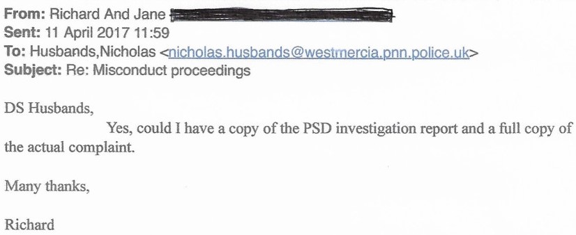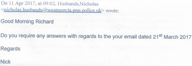 Jane also sent copies of this email to Supt Susan THOMAS, DCI Jonathan Roberts and Chief Constable Anthony Bangham. On 25th April 2017 the ‘Local PS’ responded.