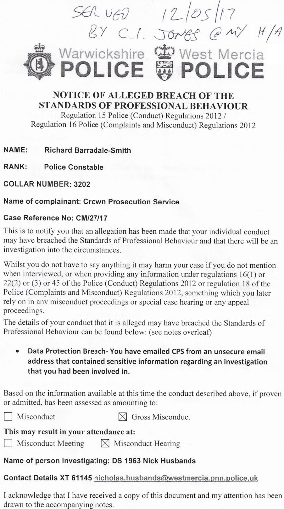 You will note that the name of the complainant is ‘Crown Prosecution Service’. (Quite obviously, Suzanne Llewelyn, a senior prosecutor). You would therefore like to think that, before making the complaint, she would be completely satisfied that, in law, I had in fact breached the Data Protection Act. It would therefore be a given that I would be prosecuted or dealt with by way of misconduct, without a doubt.
