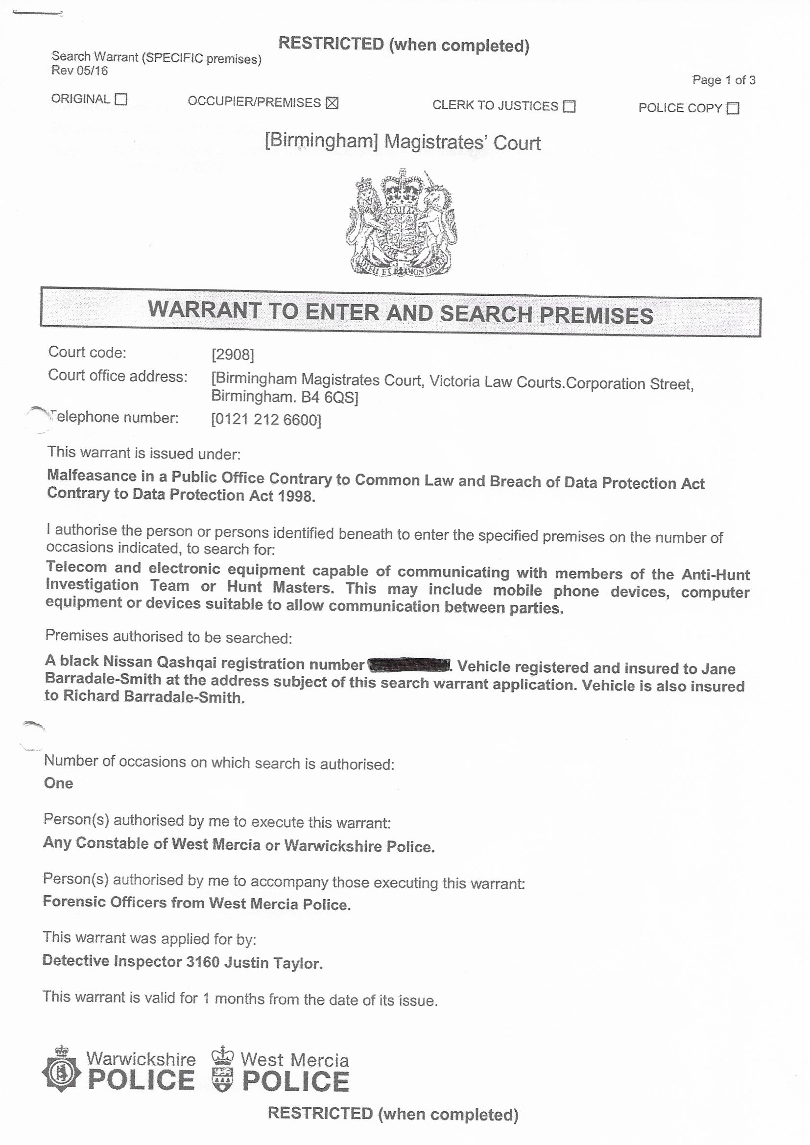 (Note on page 2, the warrants were not signed)! What is also worthy of note is the wording where the Hunt Investigation Team has been renamed the Anti-Hunt Investigation Team. Whether or not this was a conscious decision to change the name, it puts a negative connotation on the members!