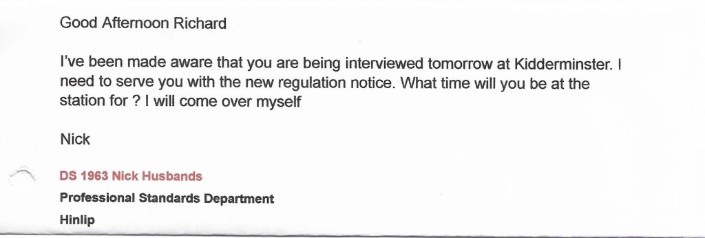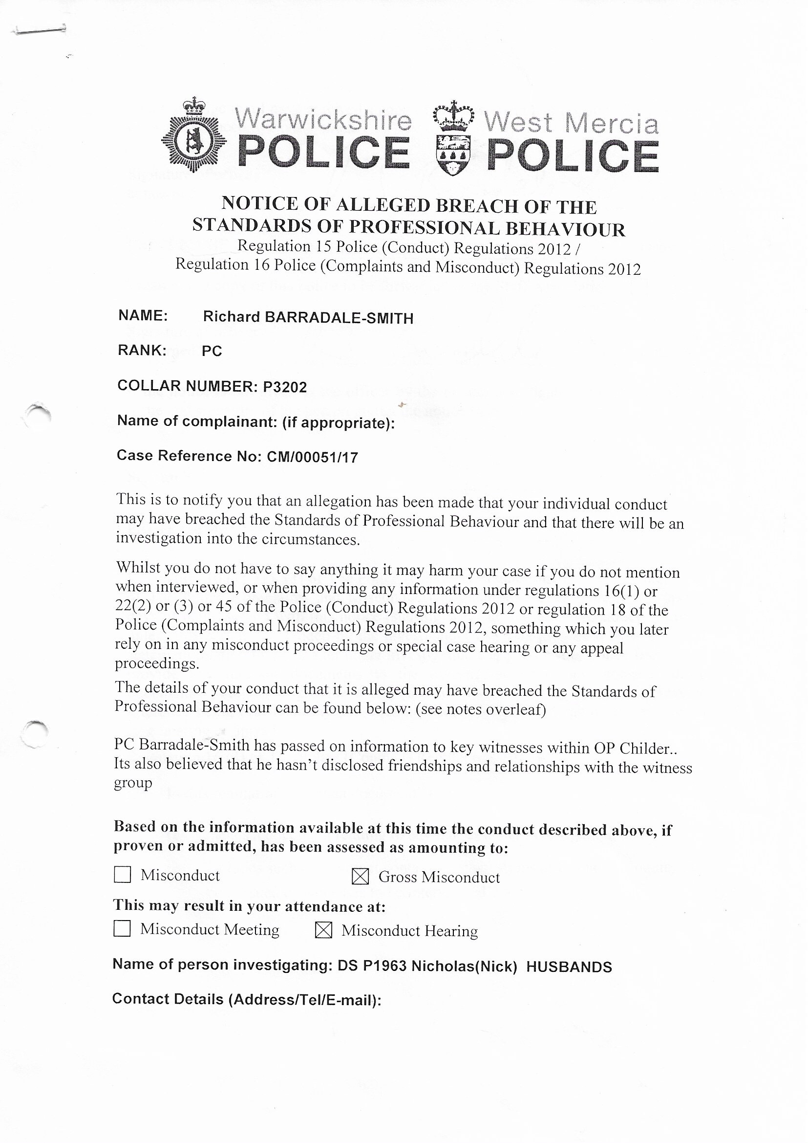 Prior to being interviewed I met DS Nicholas Husbands for the first time. He served me with the following papers for Gross Misconduct!!