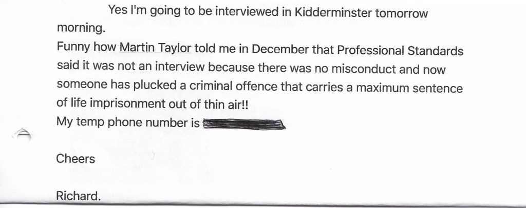 But hang on a minute. Hadn’t I already been interviewed, on 5th December 2016, about passing on information to key witnesses, (the Hunt Masters)? And hadn’t I already been interviewed about suspected ‘friendships’ and relationships with the witness group? (Paul Hale- Hunt Master and ‘Andy’ – from the HIT)? And hadn’t I already put all of the answers to these questions in a written statement for court on the same day?