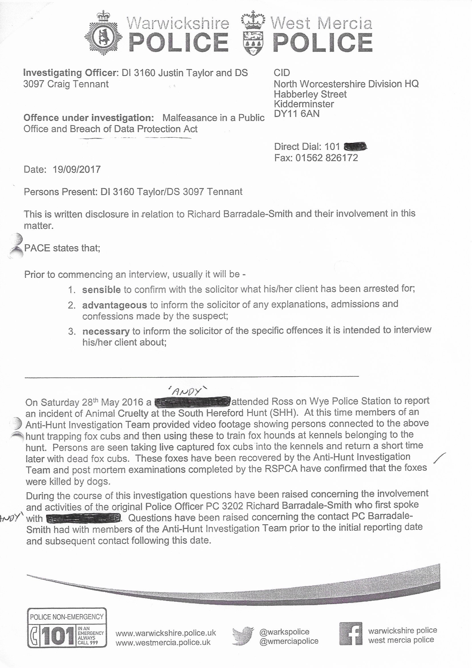 And just when I thought I couldn’t get any more disillusioned and despondent, the CID officers told me that at the same time the warrants were being served on our house, they also served a simultaneous warrant on the home address of ‘Andy’ from the Hunt Investigation Team! (The victim in the case).