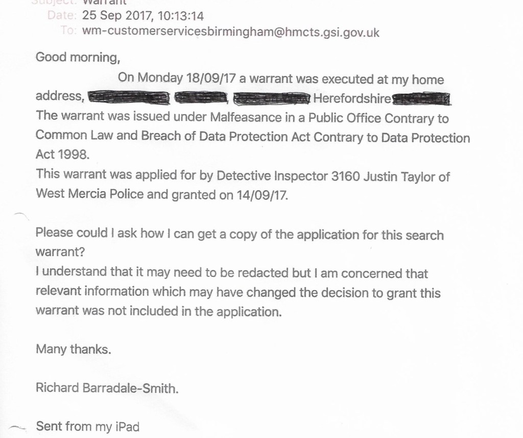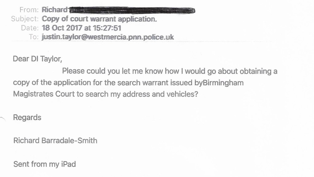 I knew I had to get a copy of the warrant application. I decided to email Birmingham Magistrates Court who had issued the warrants.