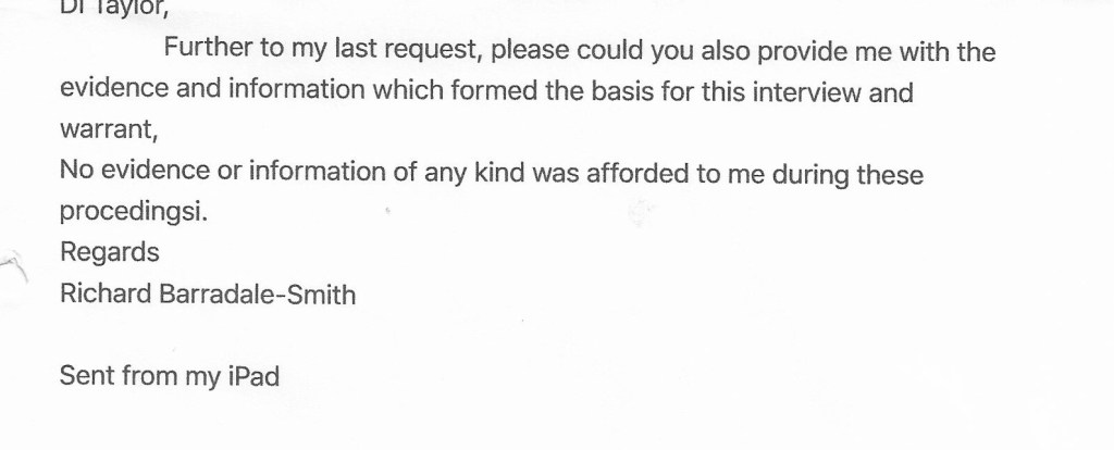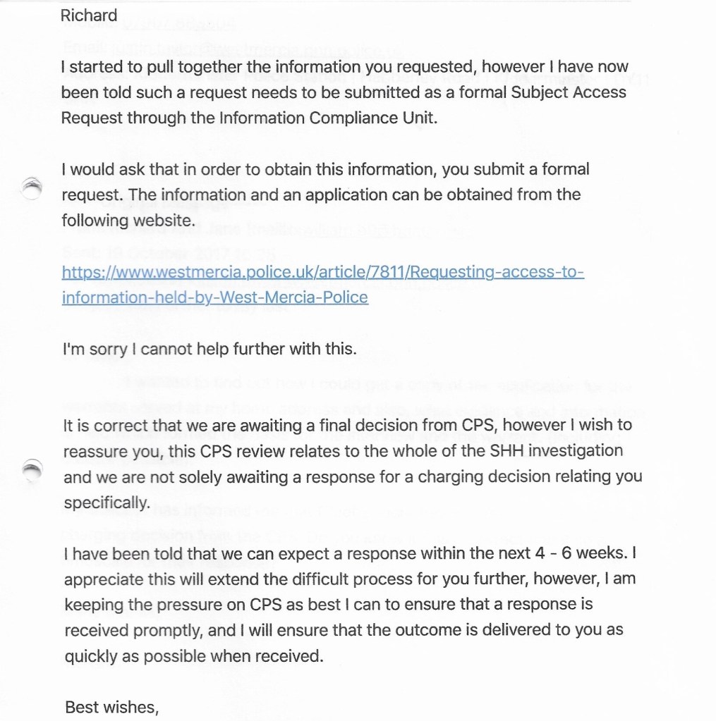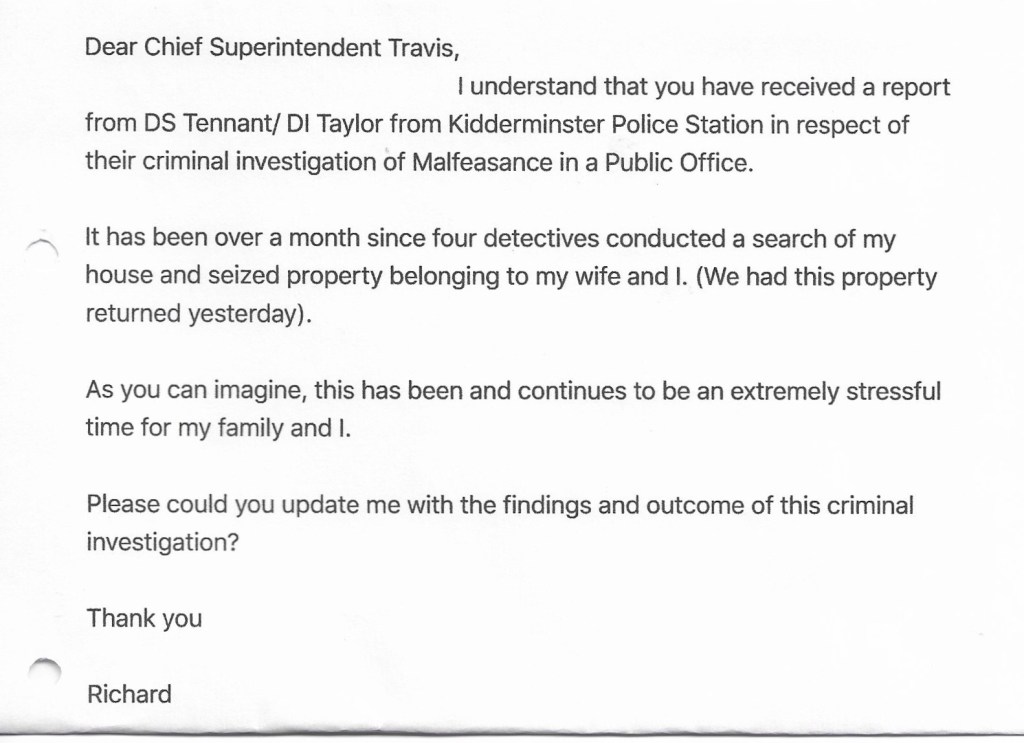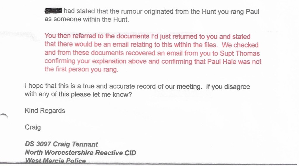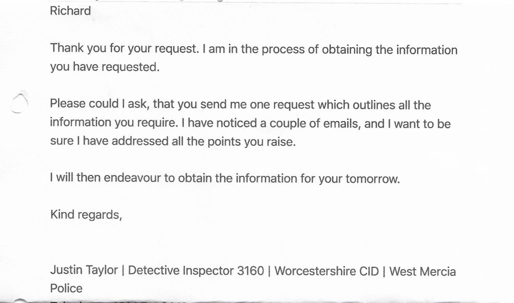 Also on 29th September I drove to Worcester to meet DS Craig Tennant who was going to return the paperwork that had been seized from me. later on this day, he sent me this email.