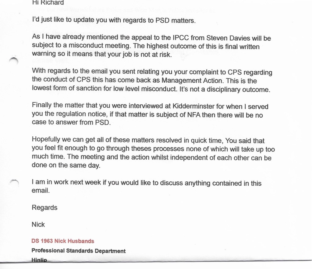 So, where we’re we? The conduct issues. On 20th October 2017, I received an update from DS Nicholas Husbands…