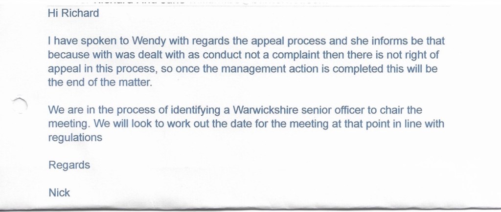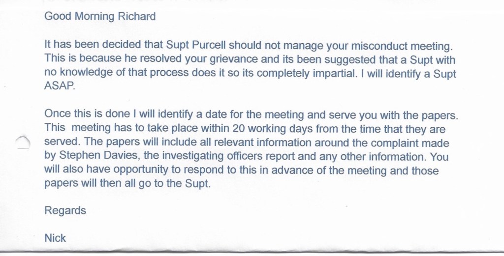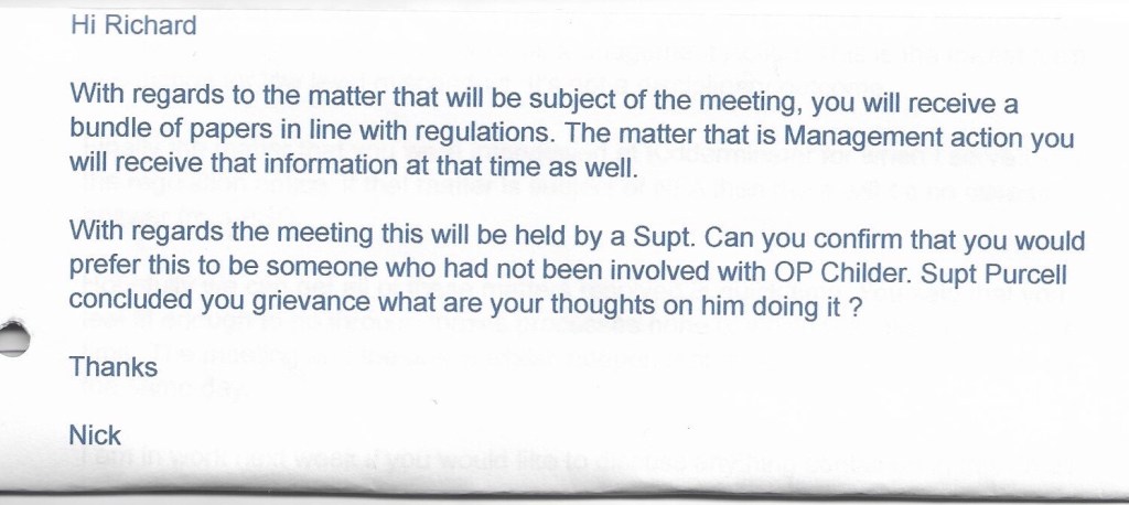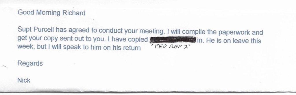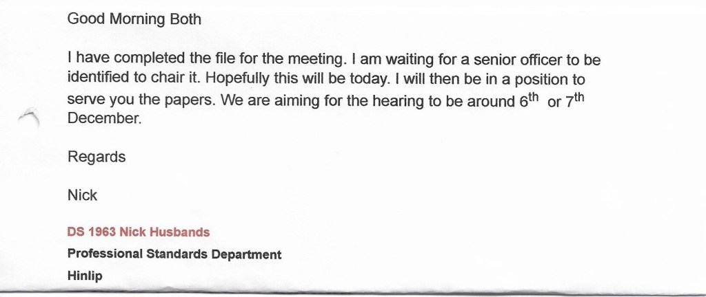 DS Husbands then sent this to myself and Fed Rep 2 on 8th November. It seemed to be taking a rather long time to ‘identify’ a senior officer to chair the meeting. Were they looking for a special kind of senior officer?