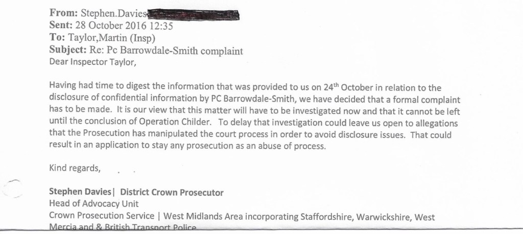 Acting Inspector Emma Whitworth discussed the case with Public Prosecutor, Stephen Davies At his request on the day after the press release to the media on 23rd June 2016. I was the officer in the case at this time and no one else knew the full details of it. She could therefore only have discussed with Stephen Davies what had been on the news. How could Stephen Davies have made a fair and impartial ‘initial assessment’ of the case, based only on what he had seen on TV? Why did he ‘raise concerns at this stage’, not having seen ANY of the evidence? And HOW DARE he write , ‘and my concern over the officer’s professionalism based upon previous experience’. He did not back this up with any evidence and I had certainly never been spoken to about my ‘professionalism’ in respect of Stephen Davies previously. He clearly had only ONE agenda and I think that was to make this case go away.