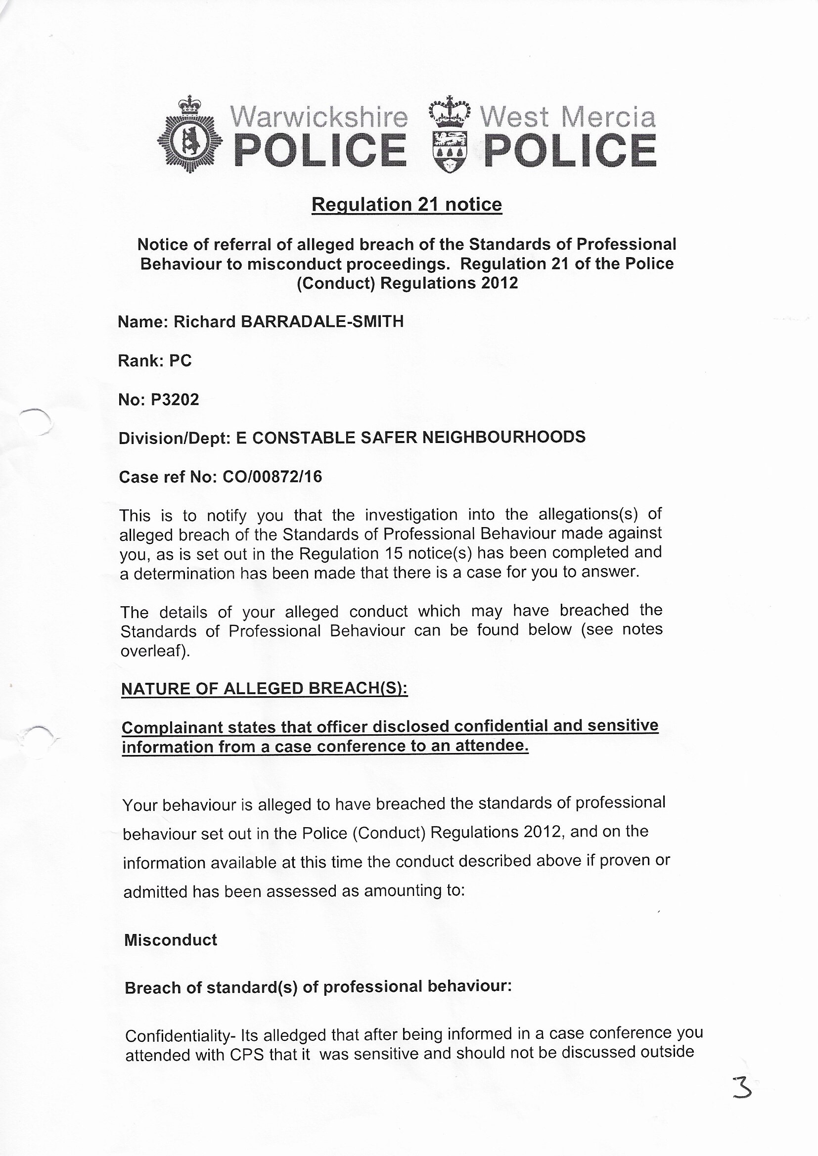 On Monday 13th November 2017, DS Nicholas Husbands and PSD Officer, Wendy Elliot attended my home address. DS Husbands served me with the following Misconduct notice.