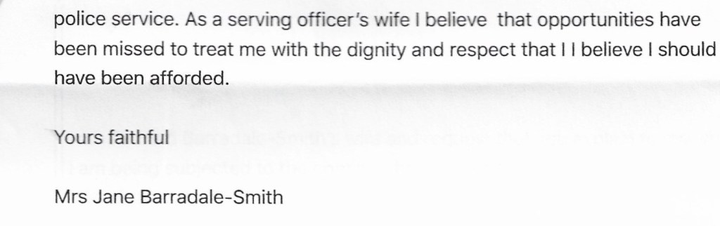DCI Paley, it seems to me that you’ve been taking the same corporate bullshit pills as Superintendent Susan THOMAS. If no one has told you to date, I am telling you that, having never met you before, on reading this letter it is clear that you believe your rank, training and accreditation is enough to put you above having to justify the actions of you and that of your officers. You are a disgrace to the uniform that you probably believe you are above having to wear.