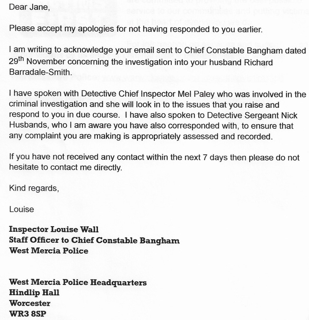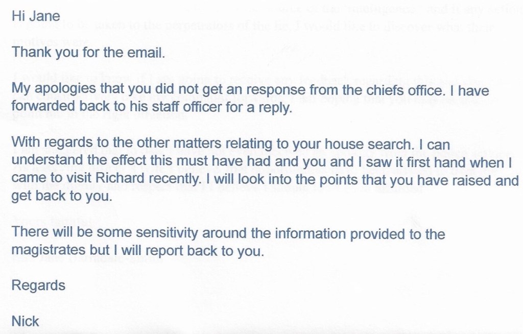 On 14th December 2017 Jane sent the following to DS Nicholas Husbands in respect of her email sent to the Chief Constable on 29th November. She had not received a response.