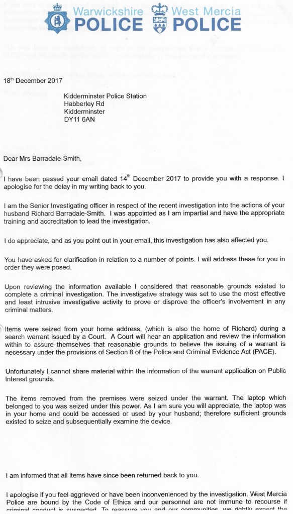 And isn’t it reassuring to hear her say, ‘ A court will hear an application and review the information within to assure themselves that reasonable grounds to believe the issuing of a warrant is necessary under the provisions of Section 8 of the Police and Criminal Evidence Act (PACE). Because no doubt as the senior investigating officer, before writing this letter she would be completely satisfied that the application for the warrant was completed correctly and in no way could have mislead the court……wouldn’t she?