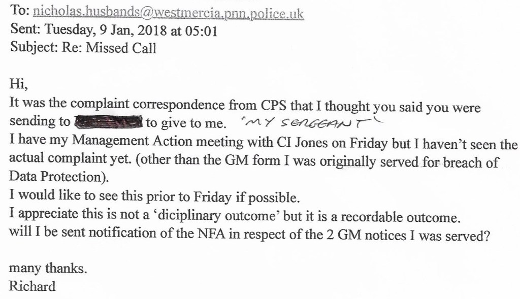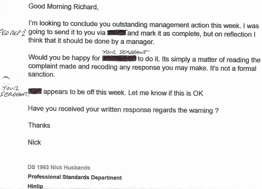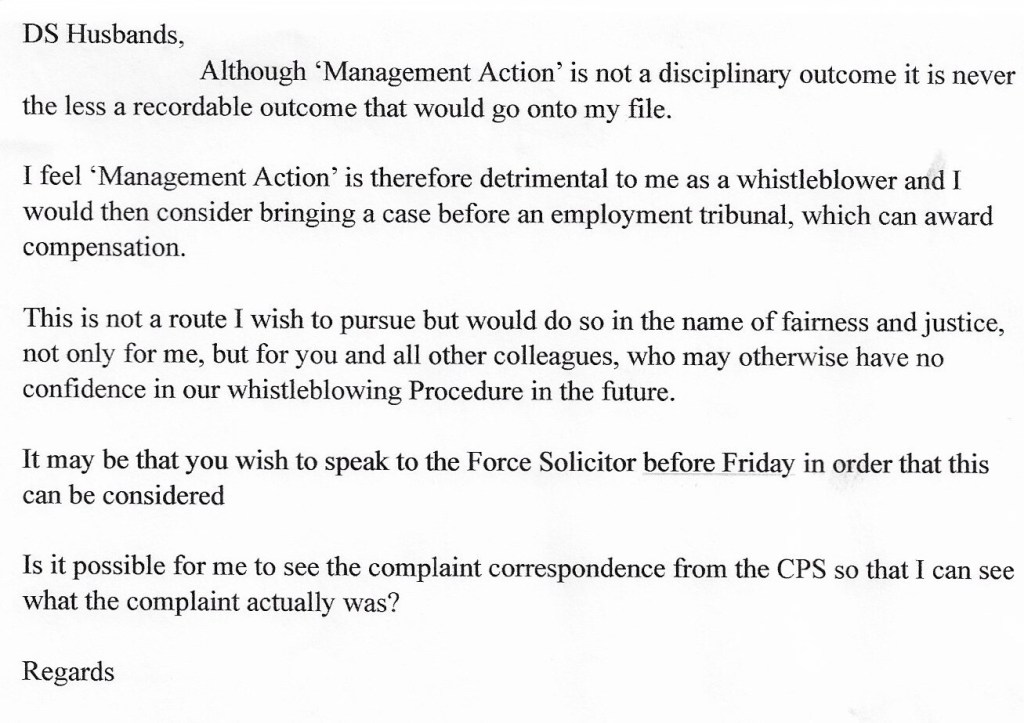 If I was to receive Management Action I wanted to see the actual complaint from Suzanne Llewelyn at the CPS. I asked my sergeant to show it to me but he said he didn’t have it so referred the request to DS Husbands. DS Husbands then made contact.