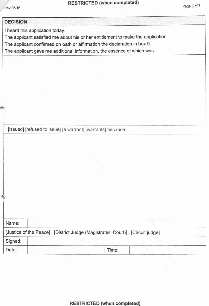 And……within the bundle of papers accompanying this letter was a copy of the application to obtain the search warrants. I will refer you back to blog 39 as you read through this application!
