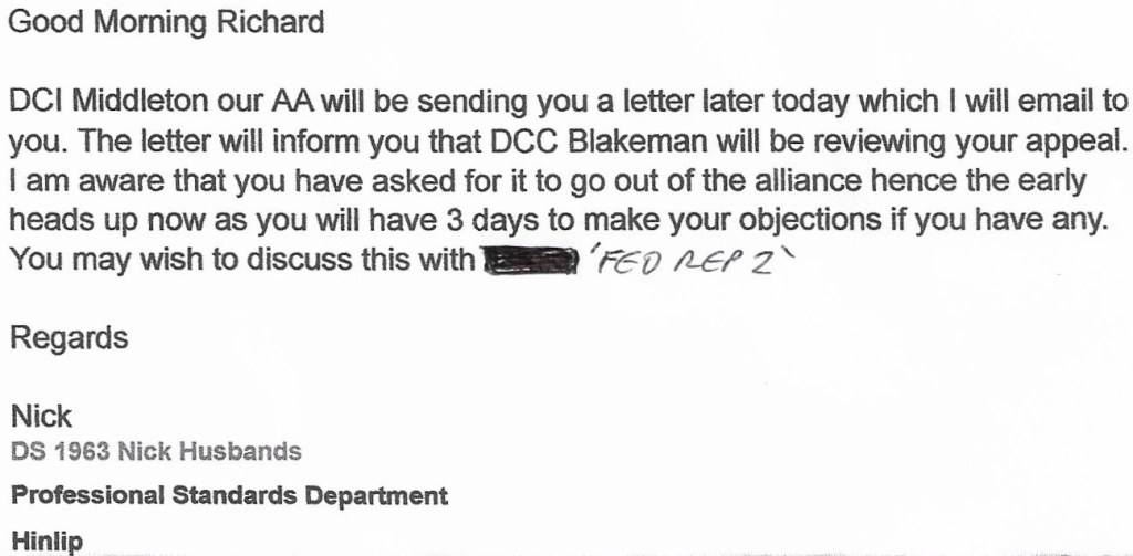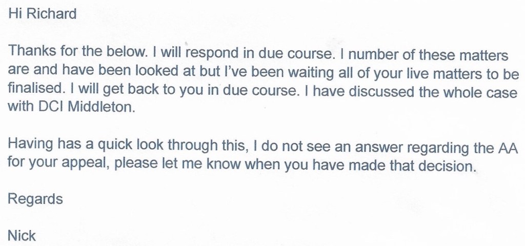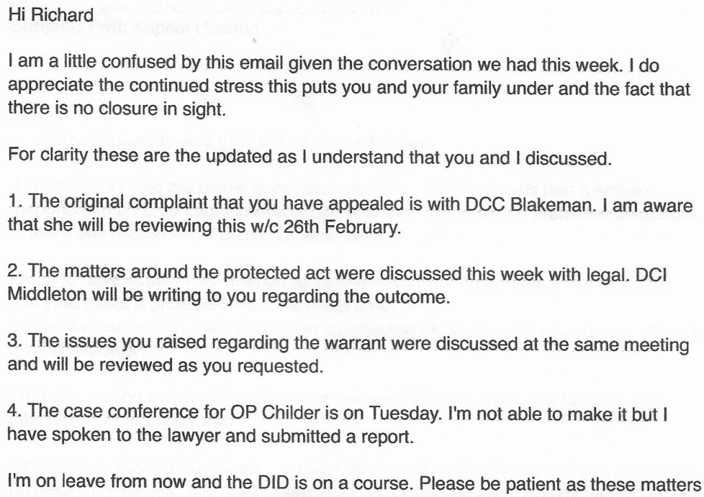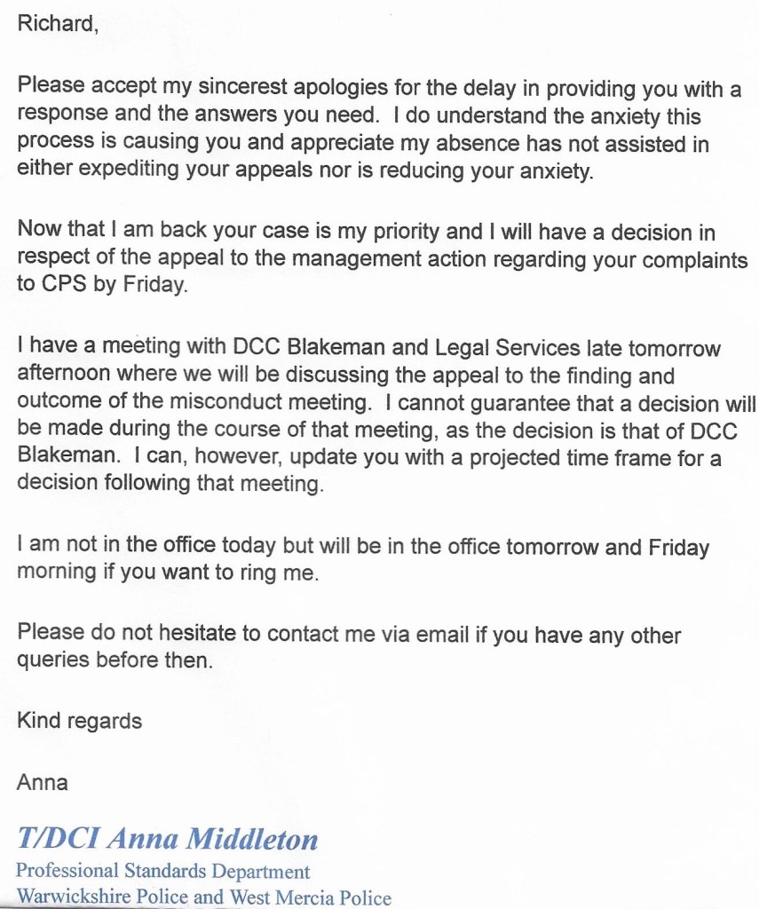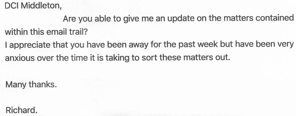 Frustrated at not really getting any meaningful responses, on 6th March 2018 I emailed DCI Anna Middleton, Professional Standards Department.
