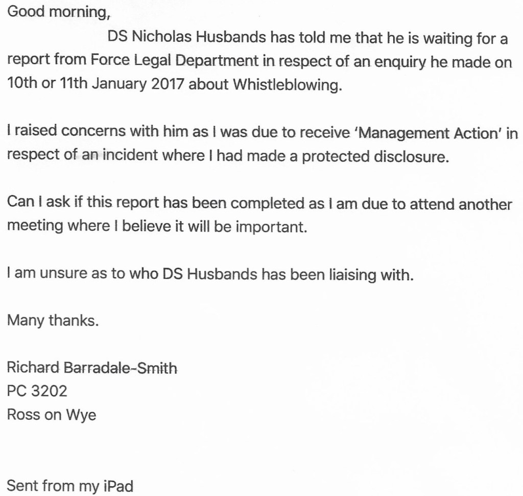 I thought I’d chase things up with the ForceLegal Department in respect of my status as a whistleblower! On 29/01/18 I sent the following email to them.