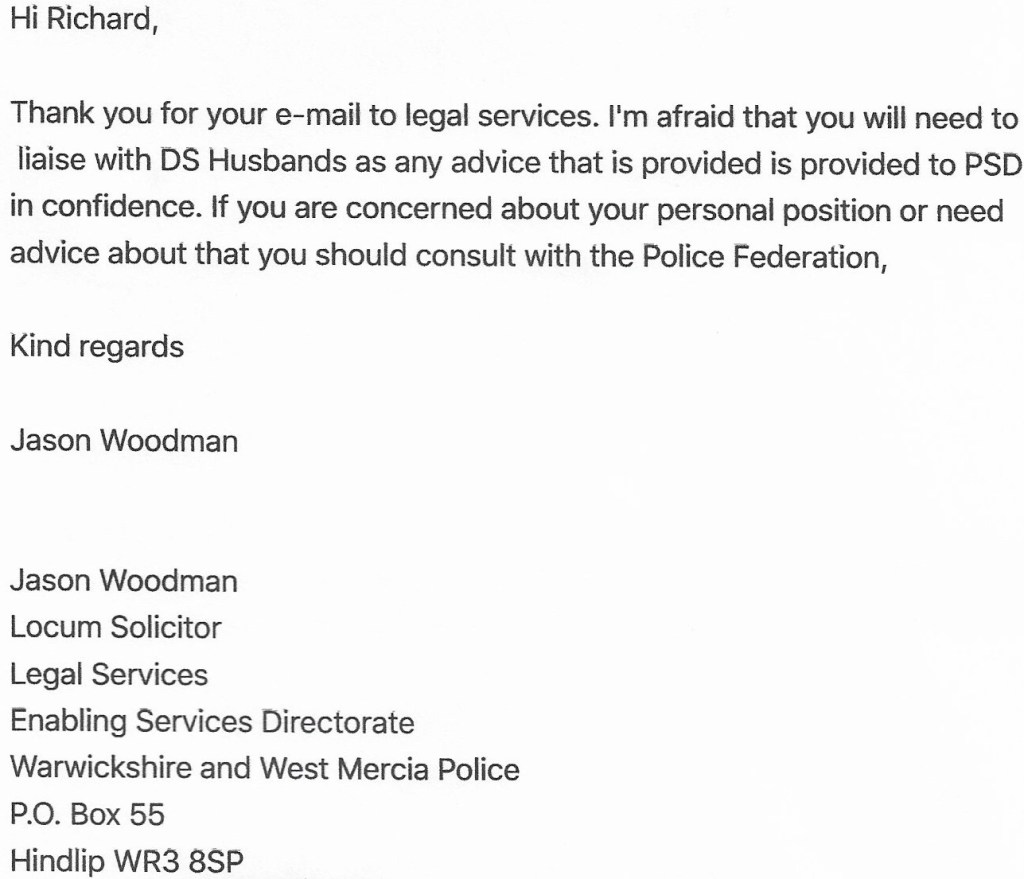 So, interesting remit from the force legal team bearing in mind I am an employee! Are they there to advice on what is right and just or are they just there to try to prevent the force being sued?