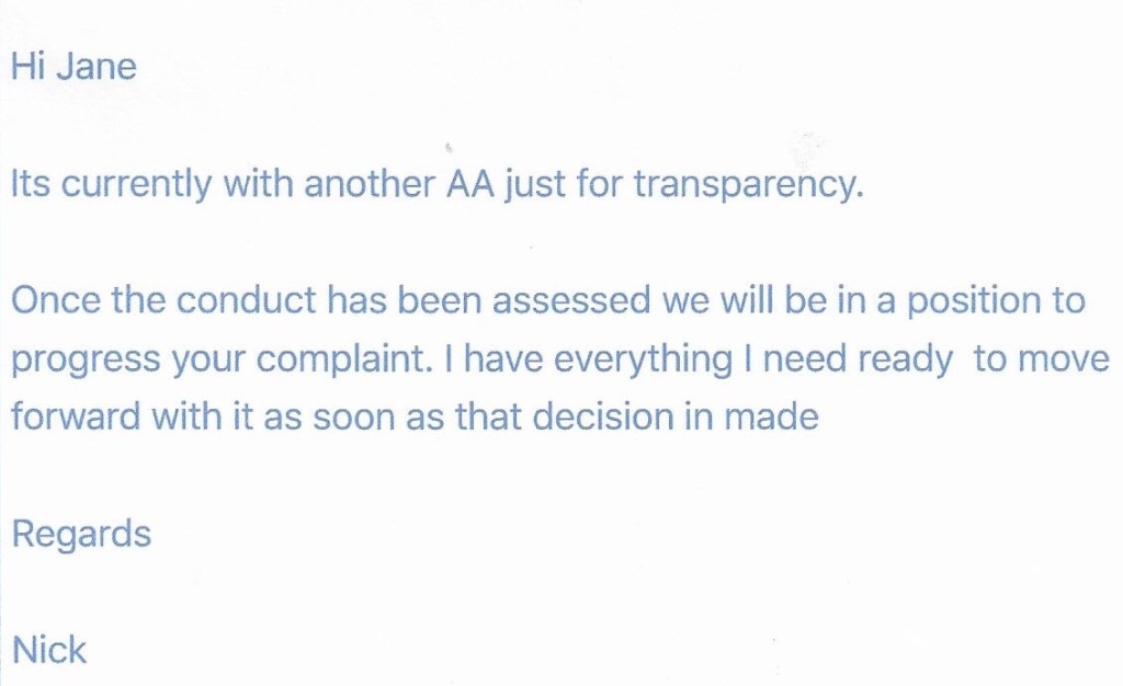 Jane also chased up DS Husbands about the concerns she had raised.